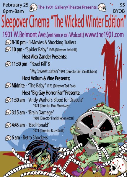 There aren’t many people that Big Gay Horror Fan will risk losing his (almost) beauty sleep over, but the cool folks at 1901 Gallery Theatre in Chicago are so sweetly awesome that I am facing the terrifying prospect of losing quality z’s for their blood chilling Sleepover Cinema “The Wicked Winter Edition, taking place this Saturday, beginning at 8pm and going on until the wee, wee wicked hours.