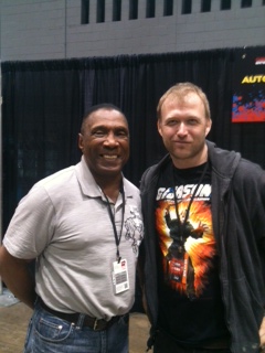 Here, I am getting my intergalactic scruffy on with actor Herb Jefferson, Jr. Best known as Lt. Boomer on the original Battlestar Galactica series, Jefferson, also, appeared in early 1970’s exploitation flick Private Duty Nurses (which is receiving a deluxe reissue in the super cool Roger Corman series in the next month or so) and worked with such theatrical greats as producer Joe Papp. He gladly shared stories about visiting the Playboy Club in Chicago while appearing in The Great White Hope with Brock Peters in the late 60’s and how Papp wouldn’t give him more rehearsal time in a show by, humorously telling him, “You just got married. Now, it’s time to go to bed!”