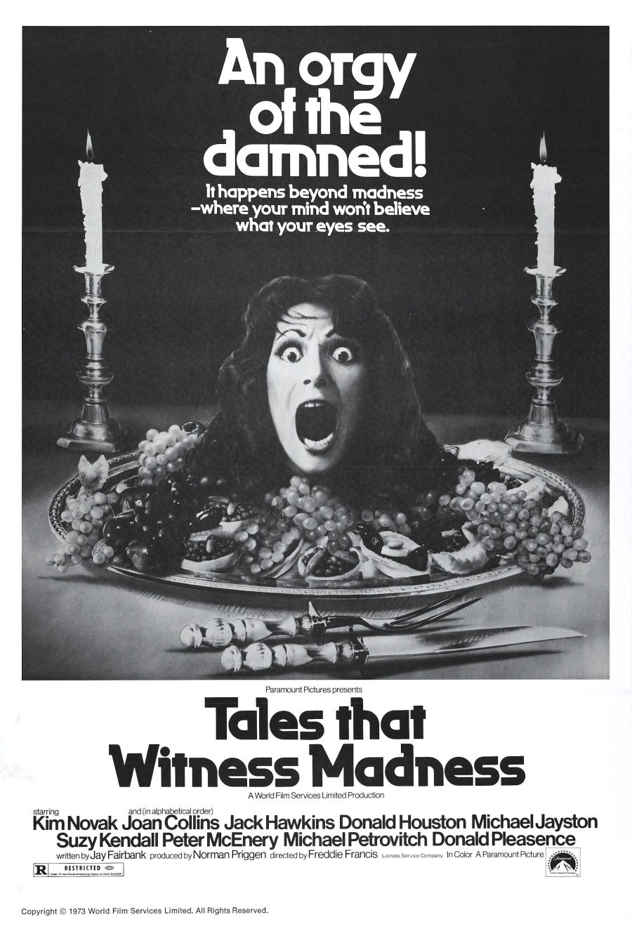 As Madness features knife throwing portraits, jealously murderous trees and cannibalistic guru’s one could almost surmise that this entry was filmed at the tail end of the UK’s horror anthology craze, as opposed to the beginning. (Popular Brit anthology horrors such as the original Tales from the Crypt and Asylum were, also, produced in 1972.) Yet, there is a gleeful outrageous at play here and the sight of Joan Collins, looking quite gorgeous in a mini nightgown and a scene commanding hair bow, attacking a very feminine tree trunk with a curved blade, in the third segment entitled “Mel”, is worth the price of uncertain spouse-hood alone.