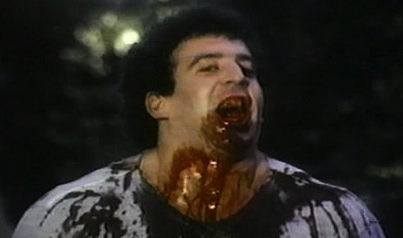 With muscles bulging and the trilling laughter of a demented schoolgirl (leaking from his throat), Steinfeld plays Jay, an asylum escapee, whom after killing a kind traveler (for his vehicle)and then gleefully bumping off an old lady in a crosswalk, sets his murderous sights on a dysfunctional family and their Turkey Day celebration. Besides the random adults (whom all seem to be plucked from a 1970s NYC porn set), potential victims include a Kiss obsessed teen whose guitar is attached to his hip and a young (seemingly) autistic girl (played by young Vinessa Shaw who, in adulthood, would enhance such projects as Eyes Wide Shut and The Hills Have Eyes remake).
