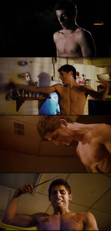 Just like the Andrea True Connection Big Gay Horror Fan wants “More, More, More” –when it comes to male nudity in his horror films, that is. Granted, 2010’s Piranha 3D featured Jerry O’Connell running around in a ridiculously tiny red Speedo and that fangy, fishy flick , also, highlights the very personal dismemberment of that buff actor’s cheesy pornographer character (including some obviously fake mangled manhood shots) – but there was truly no male butt shaking action to be found ANYWHERE in that popular summer outing. <