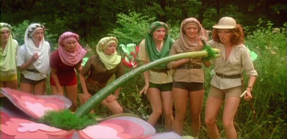 This silly monster re-imagining is very much in the style of the popular British Carry On series and Lenska excels, in the Robert Armstrong role, selling the piece’s ridiculousness with a sure wit and steely heart. It is, also fun to note that this parody (which includes takes on The Exorcist, Jaws, and – gulp – Ronald Reagan) was filmed 24 years before Scary Movie and the sequence in which it takes the piss out of the Airport series (featuring Taste the Blood of Dracula’s Linda Hayden in the Helen Reddy role) was done 4 years before Airplane! saw the light of day. Hammer honey Valerie Leon (Blood from the Mummy’s Tomb), also, makes a bikini clad appearance, here, as one of the supple jungle warriors whom drags Askwith to his initial meeting with the she-beast.